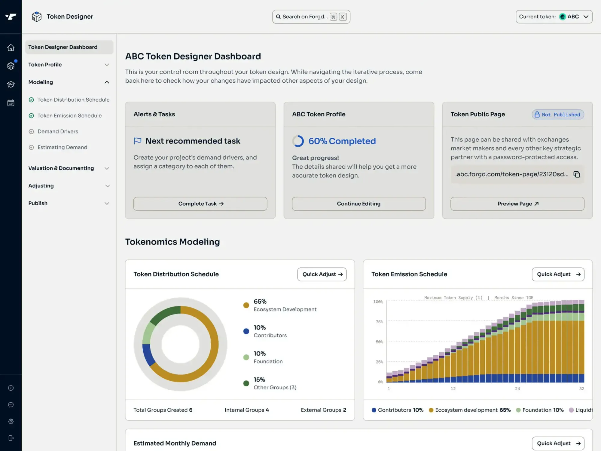 Effortlessly design your token’s economy using Forgd. Create token distributions, emissions, demand drivers, and more. Conduct simulations & publish a one-pager directly from the app.
